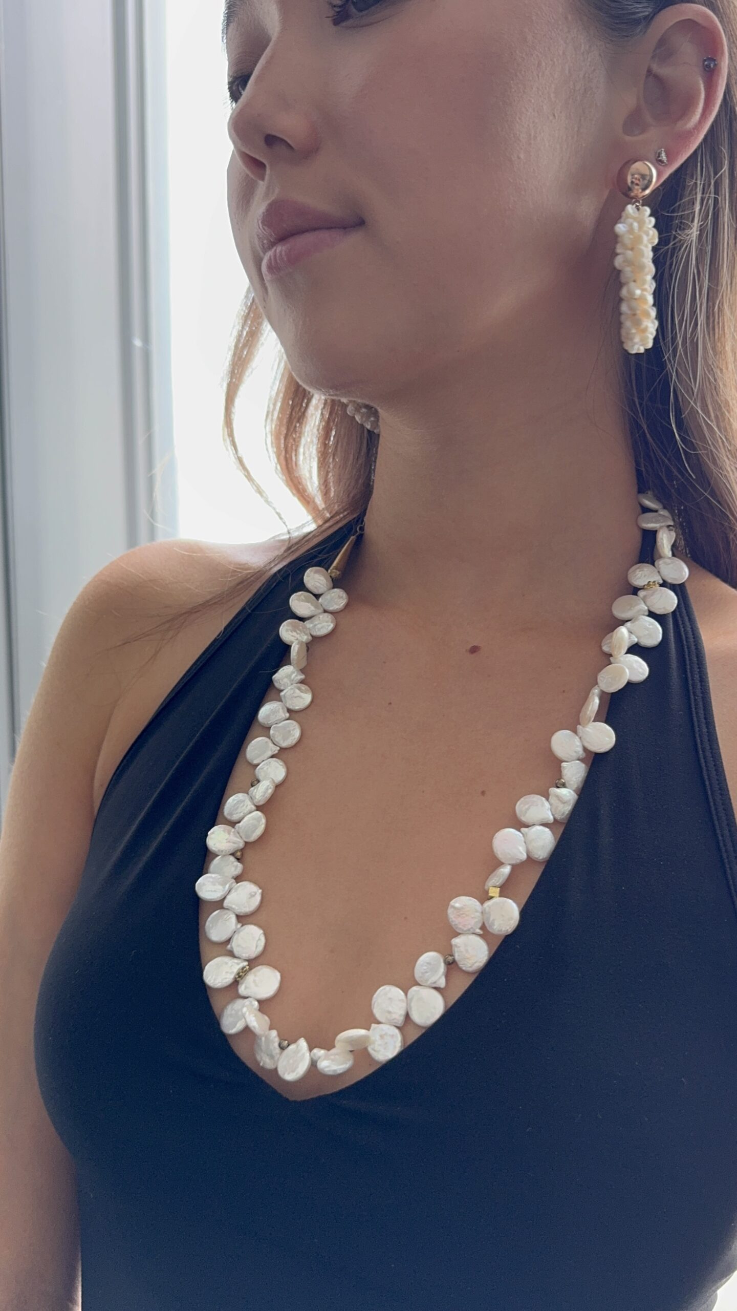 Ce collier séduisant est entièrement façonné en nacre blanche naturelle, révélant une beauté douce et intemporelle.